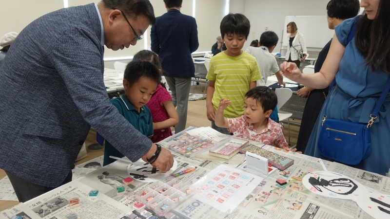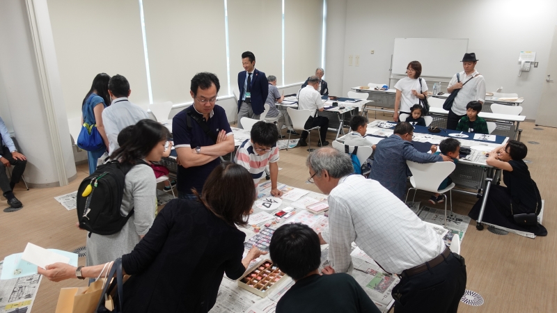 国立新美術館3階研修室でのワークショップでは、親子での参加も多く、また書象展鑑賞に来館した学生の皆さんにもご参加いただき、行事は楽しく進行しました。