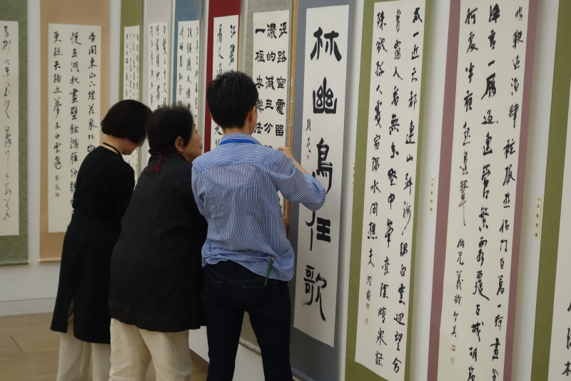 栁澤玄嶽書象展担当部長の挨拶、山口啓山本会事務局長からの作業手順の説明ののち、第1室から第23室の全室の作品陳列と出品者名札の取り付け、展示台帳の確認などが行われました。